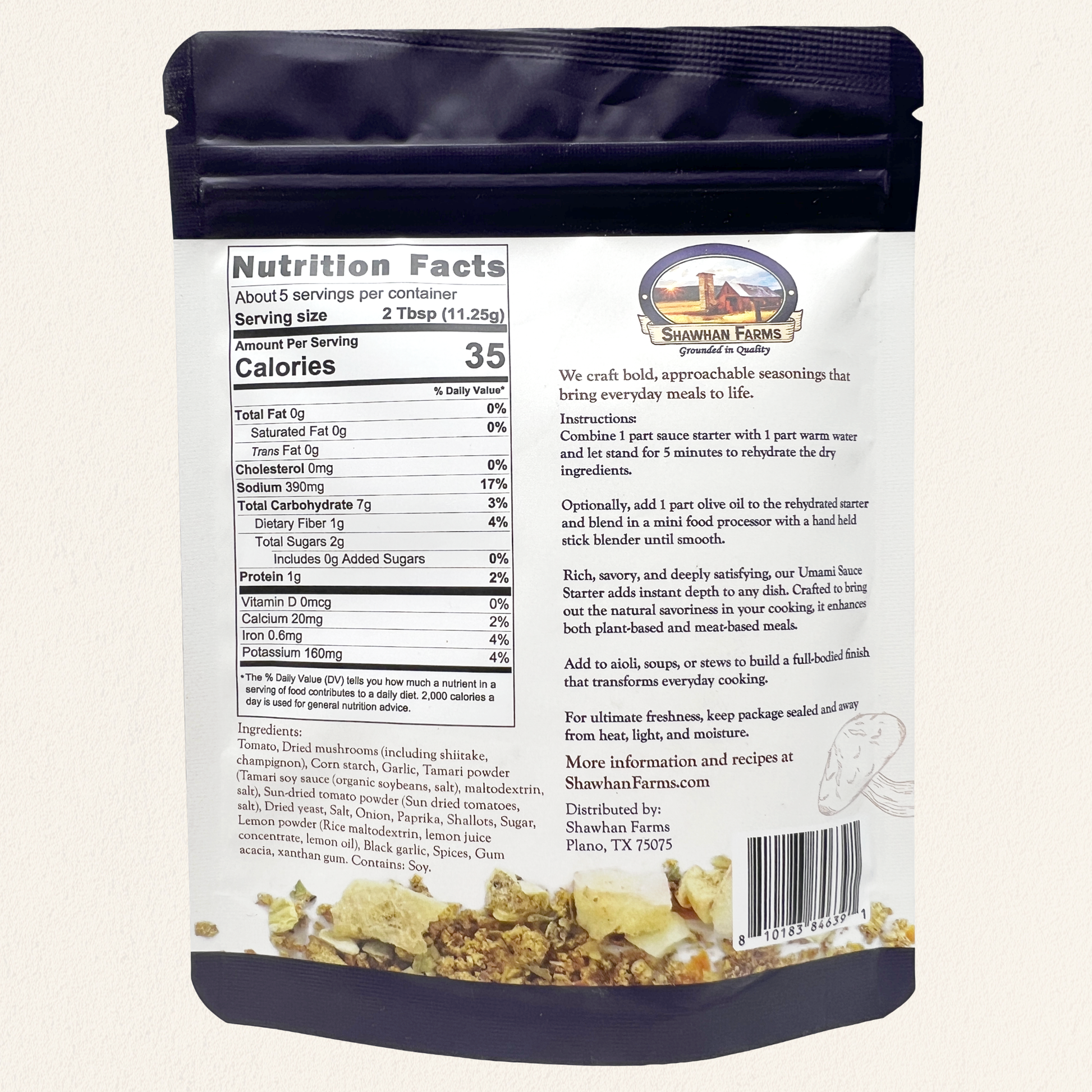 Our Umami Sauce Starter is a shelf-stable seasoning blend that makes it easy to add deep, savory flavor to everyday cooking. Just mix with warm water to rehydrate, then optionally blend with olive oil to create a smooth, creamy sauce. The result is a rich, savory base that enhances soups, sauces, meats, vegetables, and plant-based dishes. Umami is known as the fifth taste, often described as a deeply satisfying, mouth-watering savoriness. This blend delivers that flavor naturally using ingredients like dried mushrooms, tomato, tamari, black garlic, and sun-dried tomato powder. These ingredients are naturally rich in glutamates, the compounds responsible for umami flavor. Once prepared, the sauce works as a versatile flavor booster that adds depth and balance to many recipes.